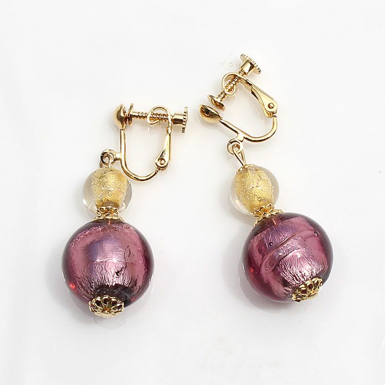 銀箔をガラスで包み込んだ、ベネチアンガラスの伝統的な技法で作られたビーズを使用したイヤリング。クリアなガラスと金箔、パープルのガラスと銀箔のコントラストが思わず見入ってしまう美しさ。