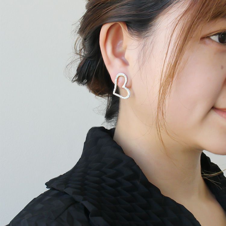 ハートモチーフにチェコクリスタルが敷き詰められたイヤリング。 愛、生命、幸福の象徴であるハートモチーフはご自分用はもちろん、贈り物にも最適。シンプルで大人カワイイデザインは様々なシーンでご利用いただけます。ステンレス製でアレルギー反応を起こしにくく、丈夫で気兼ねなく使えるのが嬉しいポイント。