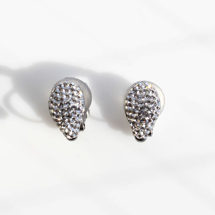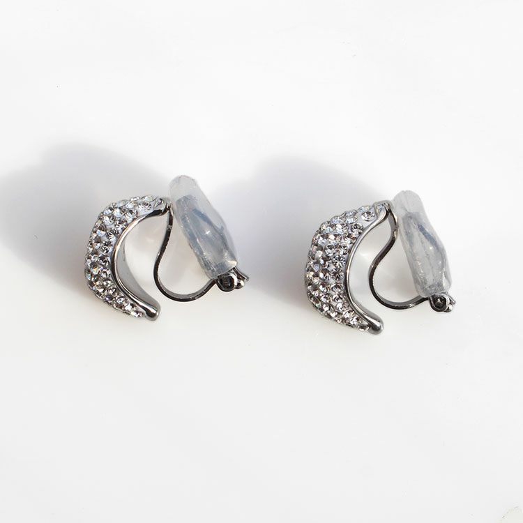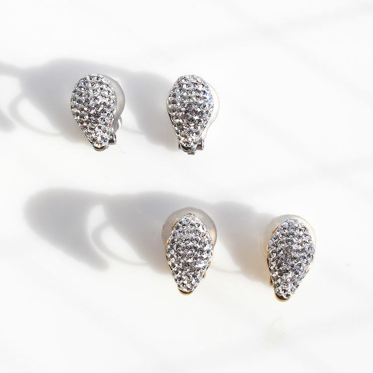 アーチ状に緩やかなカーブを描くリーフモチーフデザインイヤリング。表面にはパヴェ状にチェコクリスタルが敷き詰められ輝きを放っています。 シンプルなデザインなのでフォーマルや普段使いにと重宝しそう。 ステンレス製でアレルギー反応を起こしにくく、丈夫で気兼ねなく使えるのが嬉しいポイント。