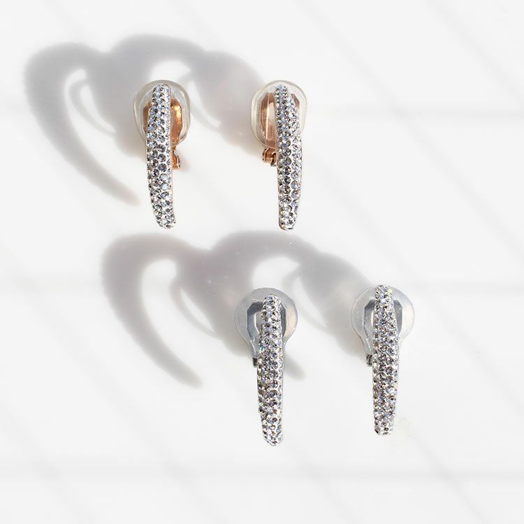 緩いカーブを描くIラインにチェコクリスタルがあしらわれた華やかなハーフフープデザインイヤリング。パヴェ状にチェコクリスタルガラスが敷き詰められ、輝きが一層引き立ちます。ポイントコーデやパーティーシーンに活躍してくれそうです。ステンレス製でアレルギー反応を起こしにくく、丈夫で気兼ねなく使えるのが嬉しいポイント。