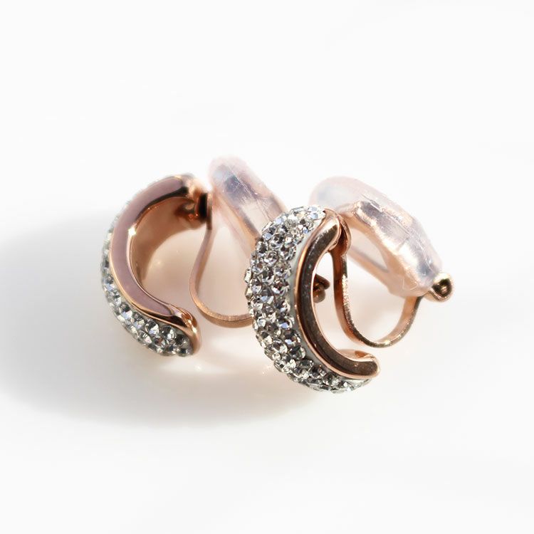 アーチ状に緩やかなカーブを描くデザインイヤリング。表面にはパヴェ状にチェコクリスタルが敷き詰められ輝きを放っています。 シンプルなデザインなのでフォーマルや普段使いにと重宝しそう。 ステンレス製でアレルギー反応を起こしにくく、丈夫で気兼ねなく使えるのが嬉しいポイント。