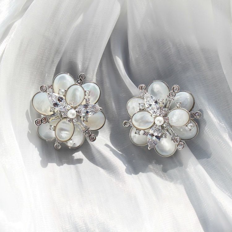 着想は雪ながら、フラワーモチーフや、マザーオブパールの淡い虹色の輝きを持つホワイトカラーなど通年使えるデザインに仕上げました。大ぶりで華やかながら品がよく、他には無いデザイン。日常からブライダル、ドレススタイルまで幅広いシーンにぜひお使いください。