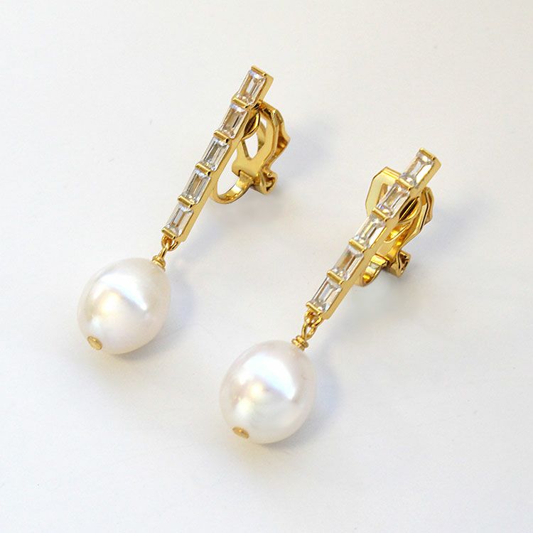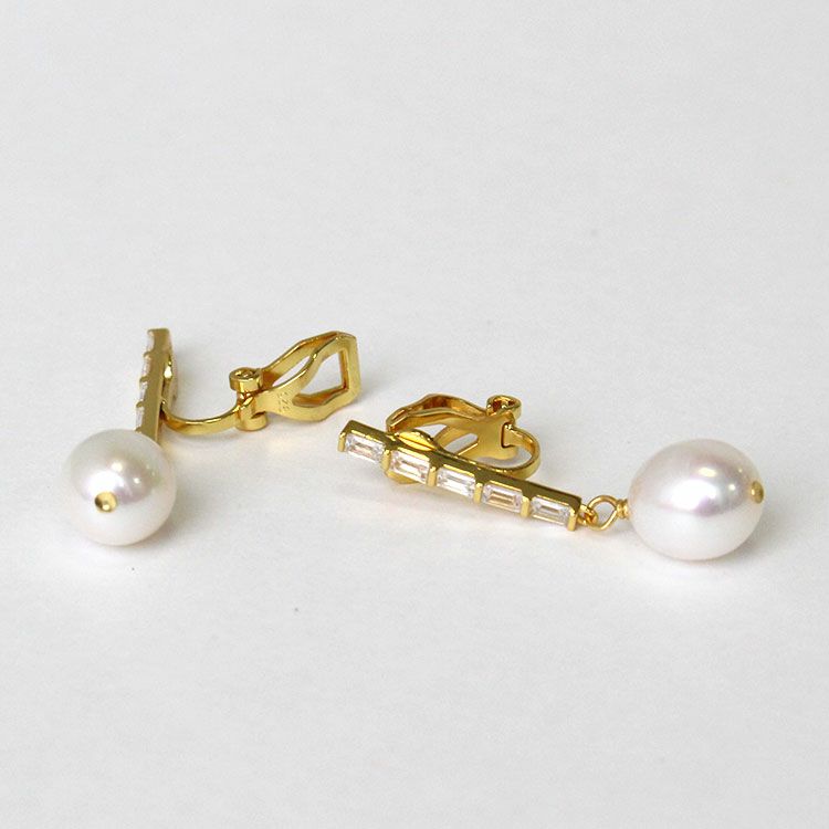 煌くキュービックジルコニアがIラインに連なる下に、やわらかくなめらかな輝きを放つ淡水パールが揺れるデザインイヤリング。スターリングシルバーを使っているので、ゴールドメッキを施していても明るい輝きを放っています。カジュアルはもちろん、オフィス使い、フォーマルまでさまざまなシーンでお使いいただけます。