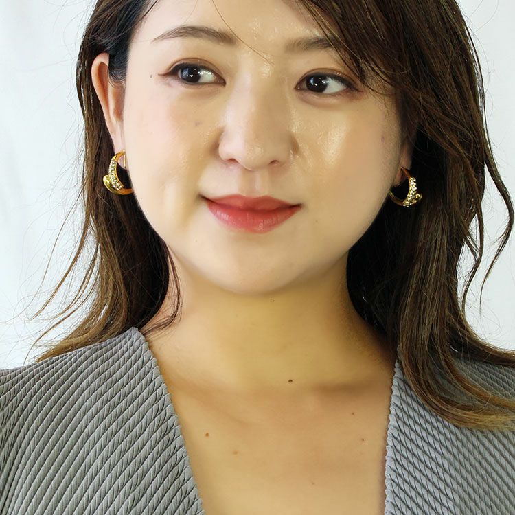 細かなクリスタルガラスがニュアンスデザインに配置されたハーフフープイヤリング。 おしゃれで華やかなデザインは、女子会やお買い物などのデイリー使いから、パーティーシーンまで幅広くご利用いただけます。ステンレス素材を使用しているので変色しづらく季節を問わずつけやすいのが特徴です。