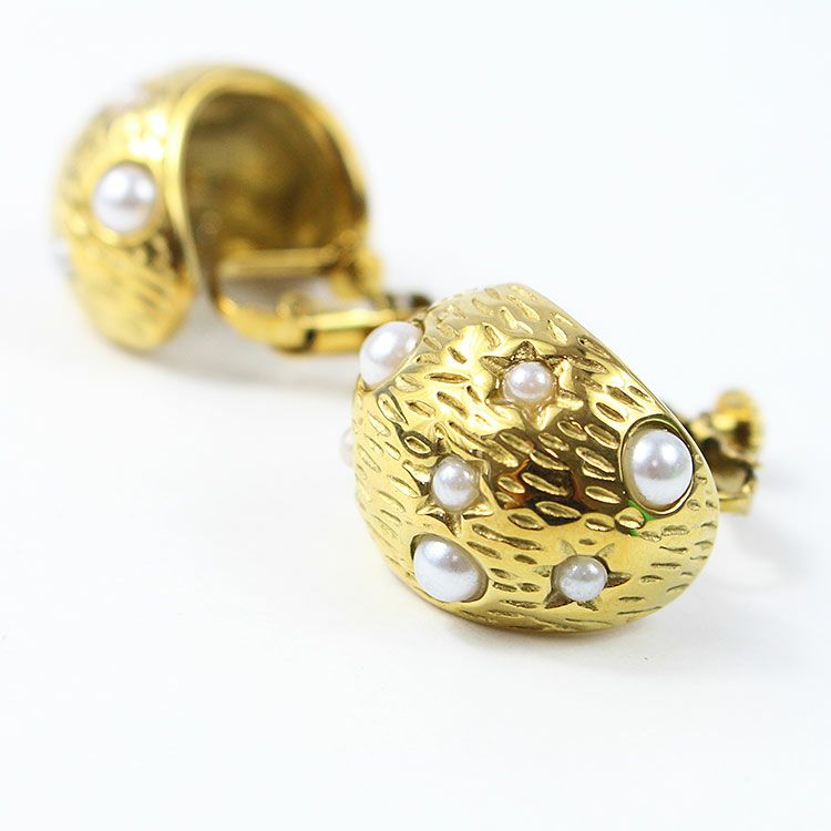表面加工を施したメタルにパールをランダムに埋め込んだハーフフープイヤリング。小さな星形に型押しされた中央に、小さなパールが配置され、まるで星空を模ったようなデザインです。 おしゃれで華やかなデザインは、女子会やお買い物などのデイリー使いから、パーティーシーンまで幅広くご利用いただけます。ステンレス素材を使用しているので変色しづらく季節を問わずつけやすいのが特徴です。