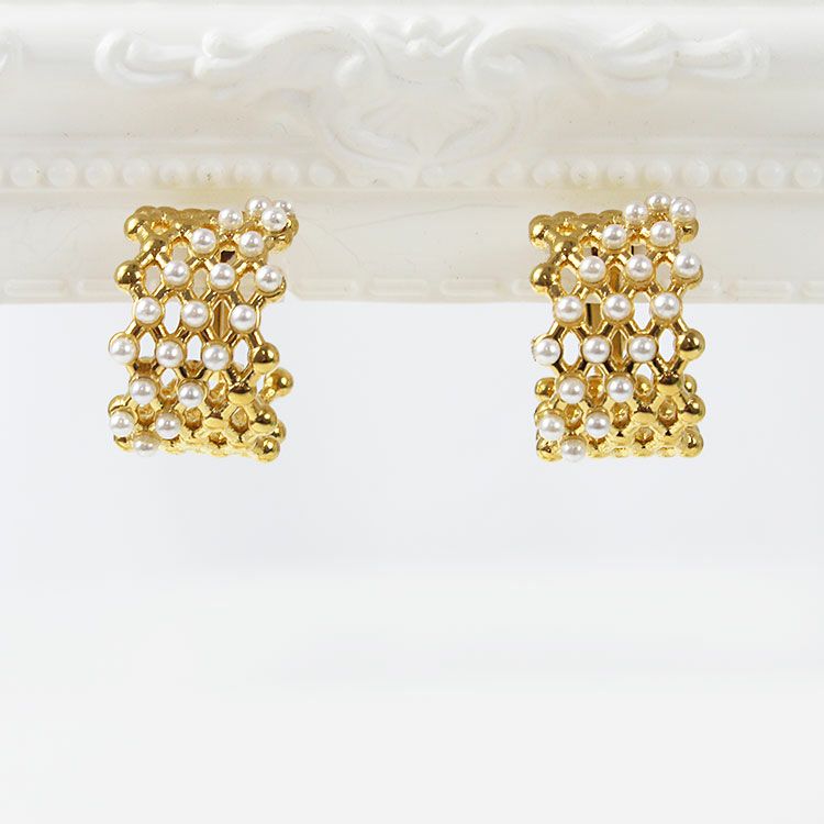 メタルメッシュに小さなパールが斜めに配置されたハーフフープイヤリング。 おしゃれで華やかなデザインは、女子会やお買い物などのデイリー使いから、パーティーシーンまで幅広くご利用いただけます。ステンレス素材を使用しているので変色しづらく季節を問わずつけやすいのが特徴です。