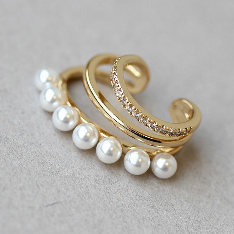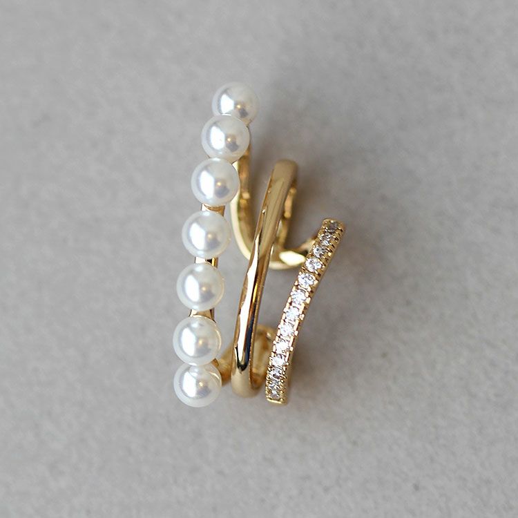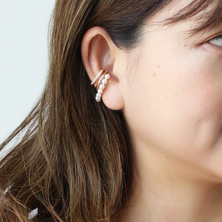 パール、キュービックジルコニアがあしらわれたデザインイヤーカフ。ピアスホールがない方でも、ピアスのように見え、簡単にオシャレ映えします。普段使いからオケージョンシーンまで、幅広くご利用いただけます。