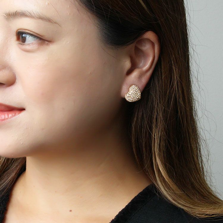 チェコクリスタルがパヴェ状に敷き詰められたハートモチーフのイヤリング。華やかで大人かわいいデザインです。ステンレス素材を使用しているので変色しづらく季節を問わずつけやすいのが特徴。女子会やお買い物はもちろん、オフィス使いやオケージョンシーン、パーティーシーンにもおすすめです。