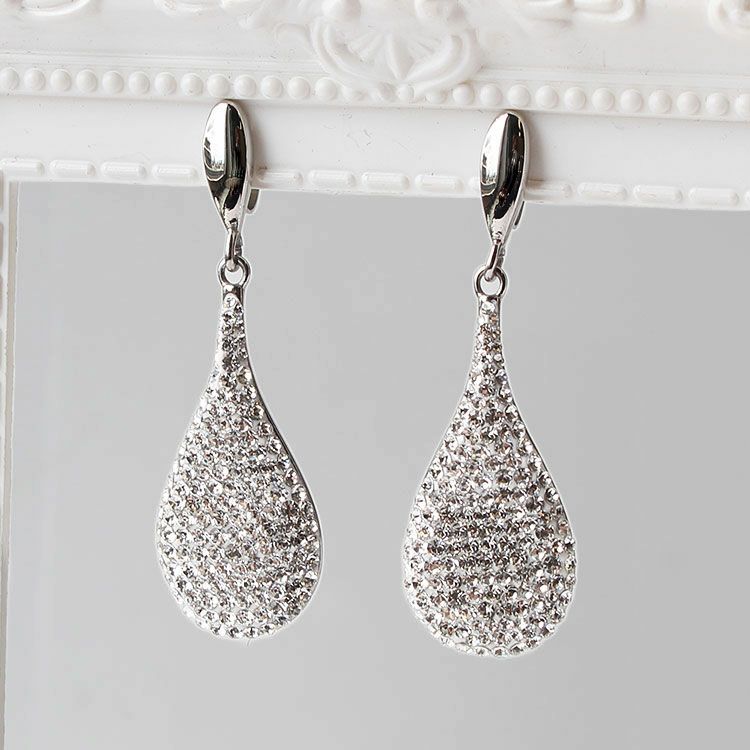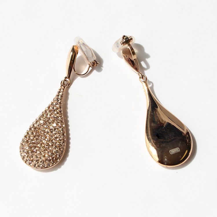チェコクリスタルがパヴェ状に敷き詰められたドロップモチーフイヤリング。大ぶりで華やかなデザインは、カジュアルな女子会やお買い物、お食事はもちろん、パーティーシーンにもおすすめ。ステンレス素材を使用しているので変色しづらく季節を問わずつけやすいのが特徴です。