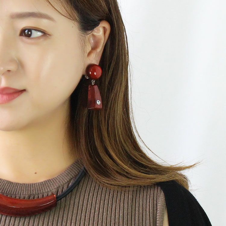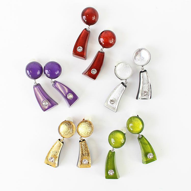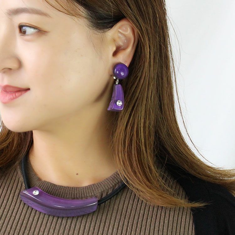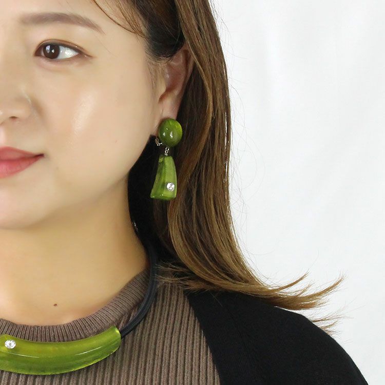 上質な樹脂、ポリエステルレジンの特性を活かし、ガラスのような質感を再現しつつも、軽くてつけやすいことで人気を博しています。肌に触れる部分に金属を使用していないため、アレルギーの方でも安心してお使いいただけます。