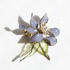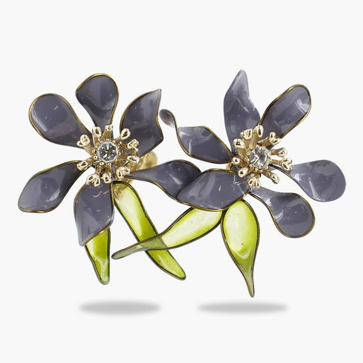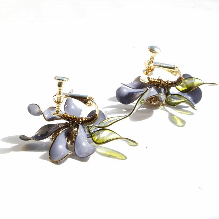合成樹脂の花びらと葉っぱの中心にクリスタルガラスがキラリと光る清楚なイメージのフラワーイヤリング。