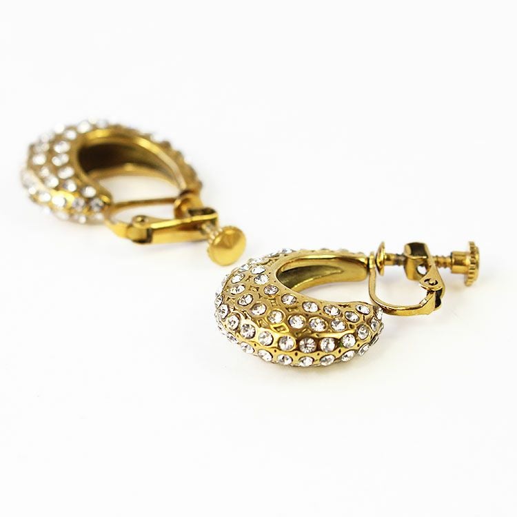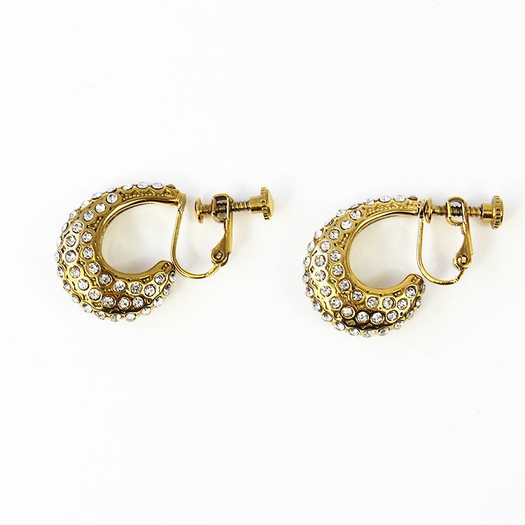 細かなクリスタルガラスが全面に配置されたハーフフープイヤリング。 おしゃれで華やかなデザインは、女子会やお買い物などのデイリー使いから、パーティーシーンまで幅広くご利用いただけます。ステンレス素材を使用しているので変色しづらく季節を問わずつけやすいのが特徴です。