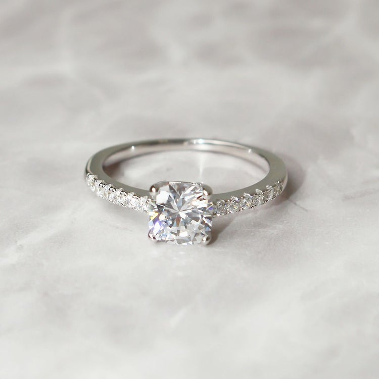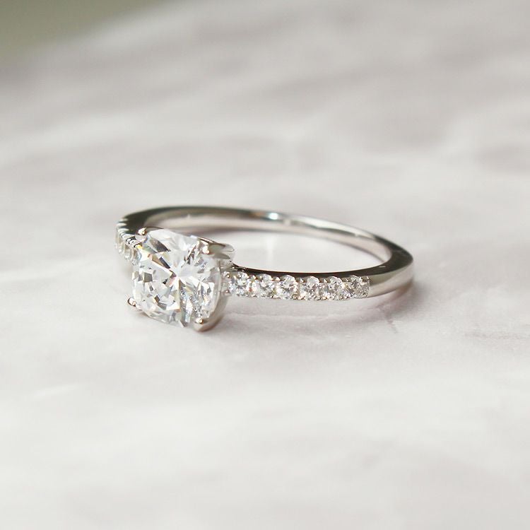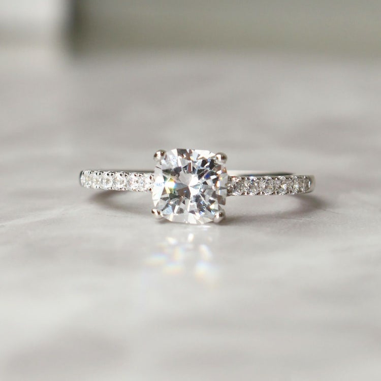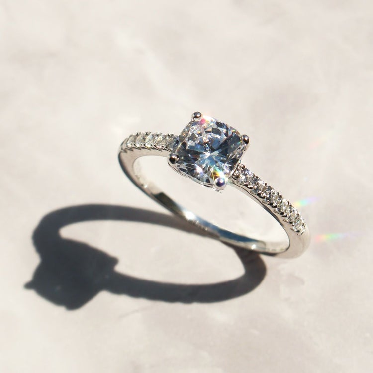 ジュエリーに用いられるダイヤモンドと同様の精巧なカットを実現した、特別なキュービックジルコニアを使用したリング。そのカット技術により、光を最大限に反射し、曇りのない美しく眩い輝きを放ちます。柔らかさとクラシカルな印象を併せ持つクッションカット。ラウンドブリリアントカット同様の多面構造なので強い輝きを放ち、四角いフォルムながら角が丸いので欠けにくいという利点も。