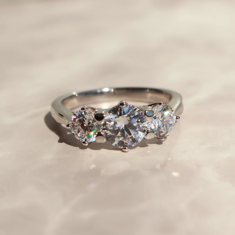 ジュエリーに用いられるダイヤモンドと同様の精巧なカットを実現した、特別なキュービックジルコニアを使用したリング。そのカット技術により、光を最大限に反射し、曇りのない美しく眩い輝きを放ちます。大ぶりなストーンを3石使用した華やかなデザイン。