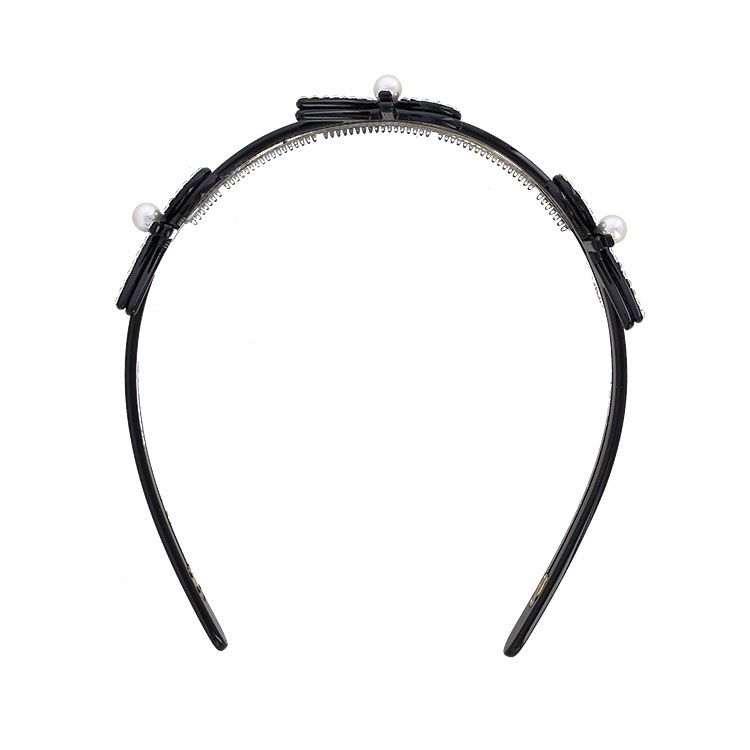 細めのカチューシャにキュートなリボンがアクセントになったリボンカチューシャ。煌めくビジューがリボンをカタチづくり大人カワイイデザインになっています。