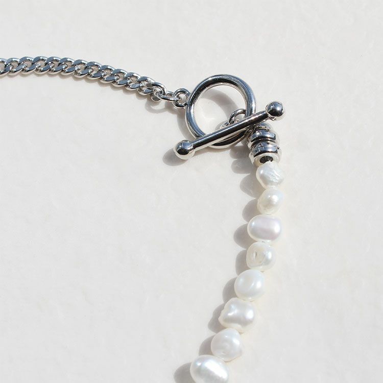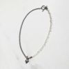 淡水パールとスタイリッシュなメタルチェーンを組み合わせたネックレス。甘すぎないシェイプの大人可愛いハートのマンテルを前にしても、ノーマルなマンテルを前にしても使える2Way仕様です。