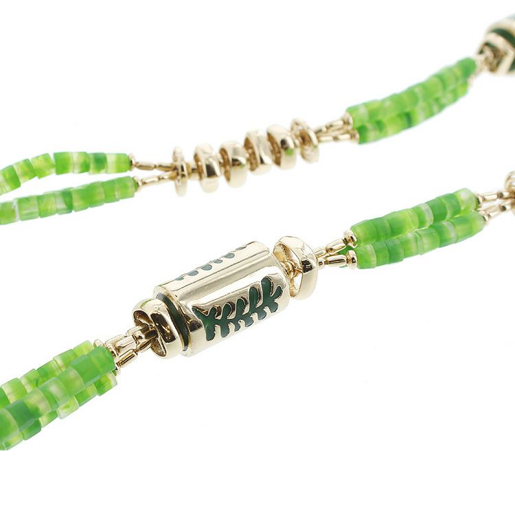 透明感のあるグリーンがコーディネートの差し色にぴったり。ゴールドのパーツが印象を引き締め、高級感をプラスします。