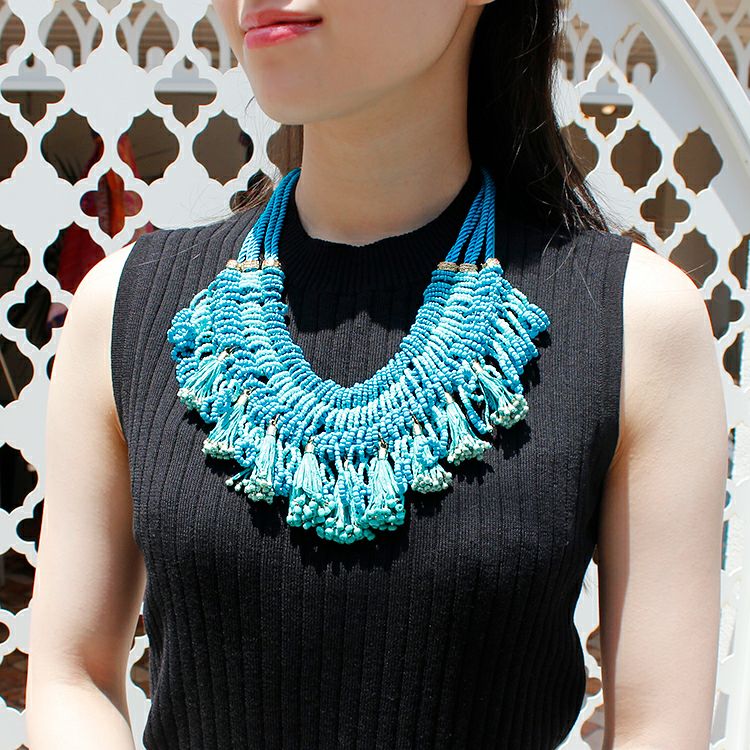 このボリューム感が自慢のネックレス。フリンジ部分には涼しさ溢れるペーパーを使用しています。ターコイズブルーの爽やかカラーでこの夏の主役に。