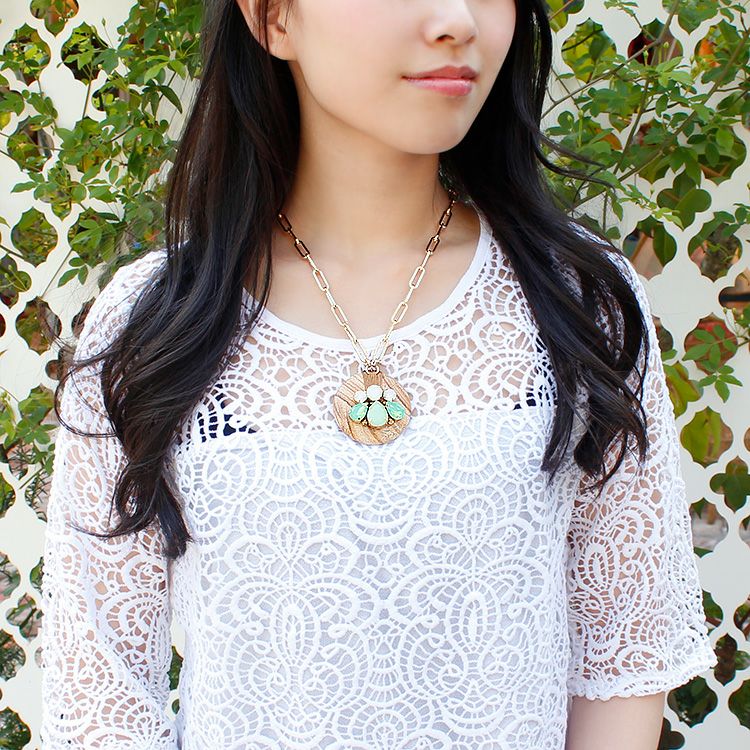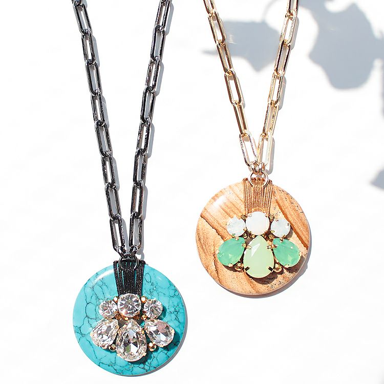 リゾート風の大ぶりなモチーフがポイント。モチーフ中心のクリスタルガラスが、光に当たるたびに輝きます。