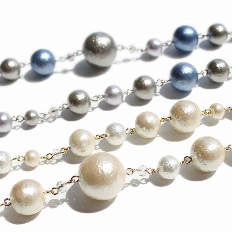 大小2色のコットンパールとクリスタルガラスのロングネックレス。
