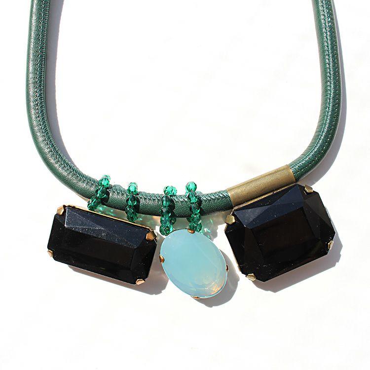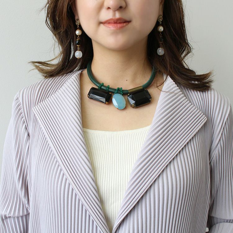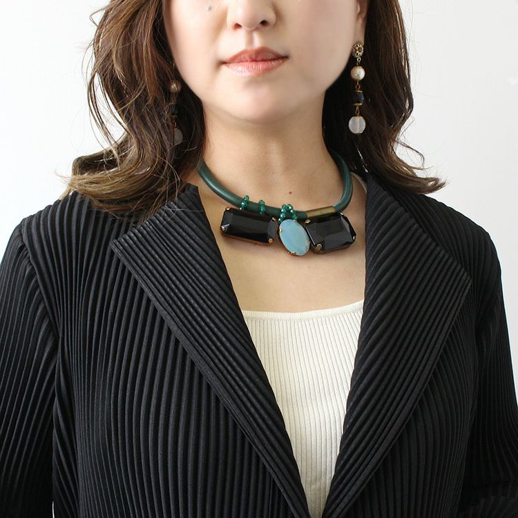 山羊革とガラスビーズの色合いが絶妙なウンゲルのショートネックレス。柔らかい山羊革を使用しているので着け心地も良く、留め具がマグネットクラスプのため付け外しも簡単です。
