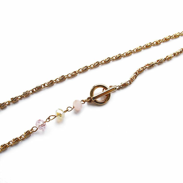 パステルカラーのガラスビーズにゴールドのチェーンが華やかな雰囲気のロングネックレス。マンテル金具の留め具がアクセントになっています。