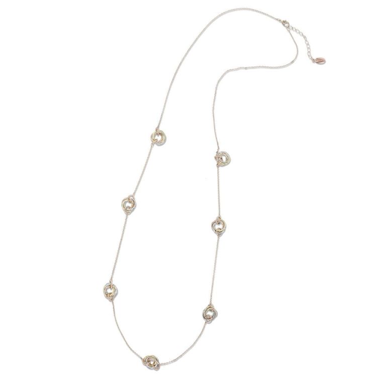 ピンクゴールド、ゴールド、シルバーの3色のリング状のメタルパーツを組み合わせ、クリスタルガラスをあしらうことでさりげない煌めきをプラスしたロングネックレス。シャツ、カットソー、ニットと何にでも合わせやすいデザインです。