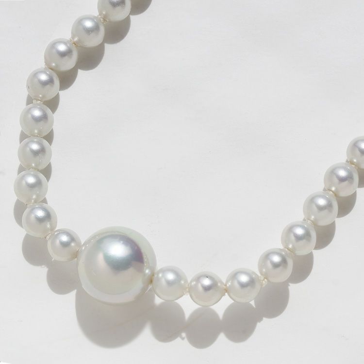 ガラス製の核に地中海に含まれる天然成分を素材とするパールエッセンスを幾重にも塗り重ね、人工でありながらも、内側から輝くような光沢・色合い・巻の厚みを再現しています。傷が付きにくく、汗や化粧水による品質変化が少ないため、天然真珠よりも扱いやすく、気軽に装えるのもマジョルカパールの魅力。夏でも素肌に安心してつけられます。