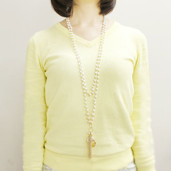 2連のガラスビーズにドロップ型のクリスタルガラスビジューとフリンジのついたロングネックレス。