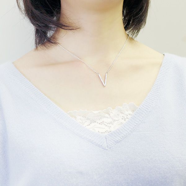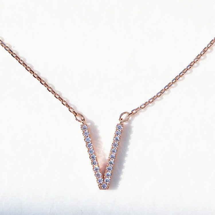 キュービックジルコニアの輝きが美しいショートネックレス。華奢なチェーンにV字のデザインがスッキリと上品な印象にしてくれます。