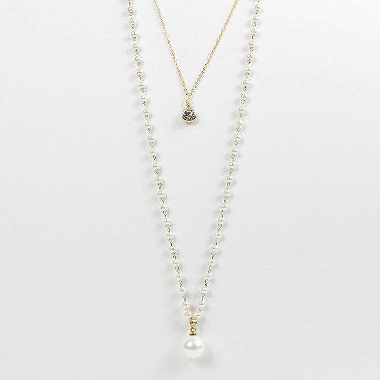 小さなパールネックレスにチェーンがレイヤードになったロングネックレス。パールネックレスには大粒のシェルパールがアクセントに。チェーンにはキュービックジルコニアが煌めき、華やな印象を与えています。軽くて使いやすいので、デイリーからオケージョン、フォーマルまで、幅広くご利用いただけます。