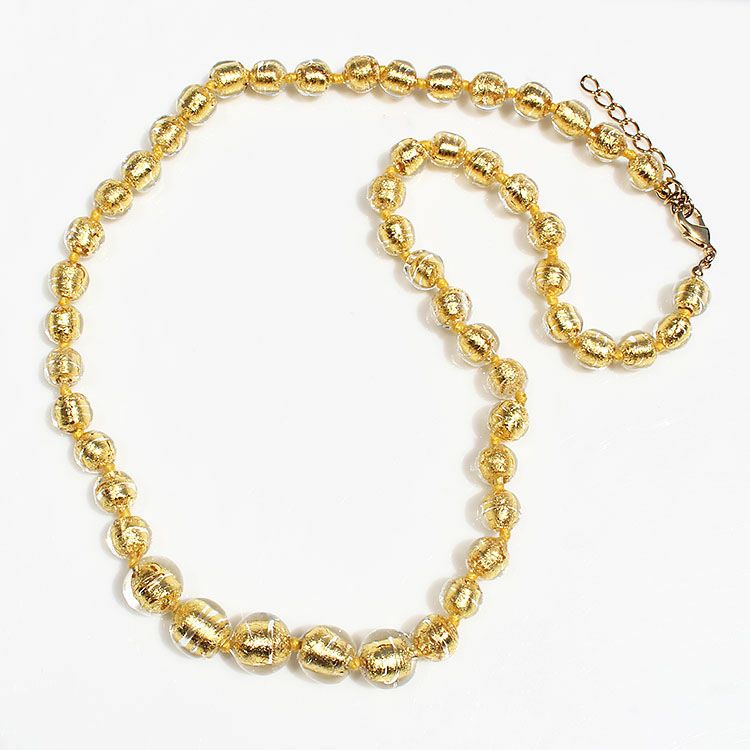 瑞々しいクリアのガラスに包まれた金箔が美しく煌めき、様々な表情をみせてくれるロングネックレス。シンプルなデザインでも、優しさや温かみ、柔らかさを感じさせるのは、他のヨーロッパクリスタルやガラス製品とは異なる、ベネチアンガラスならではの不思議な魅力です。