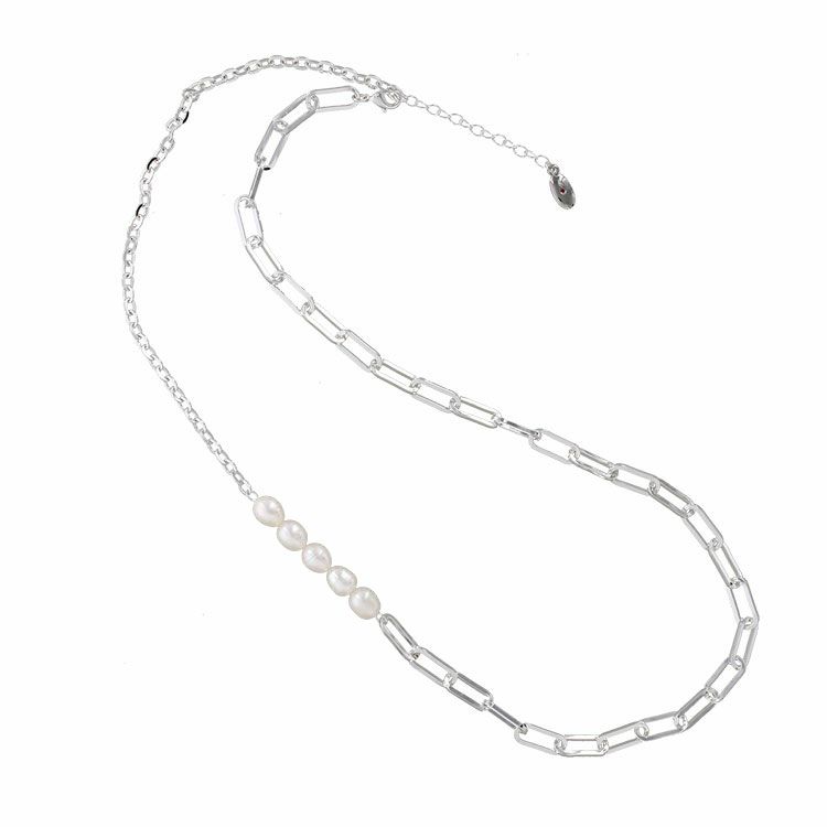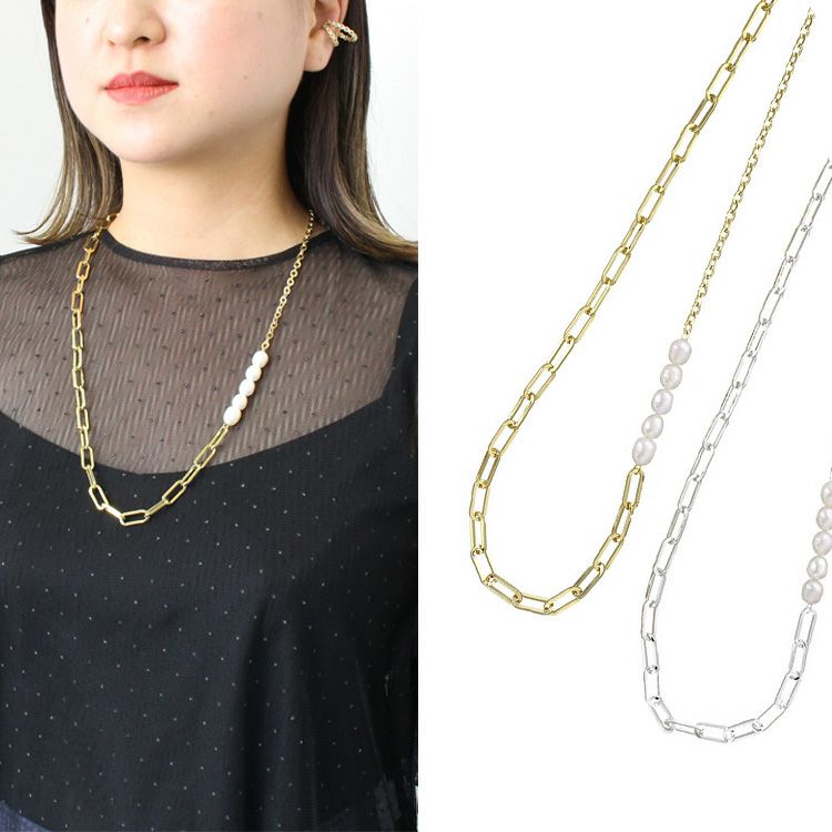 淡水パールをアクセントに配したメタルチェーンネックレス。使いやすい長さのネックレスはアジャスターを含めると最大75cmに調整可能。エレガントにもカジュアルにもお楽しみいただけます。