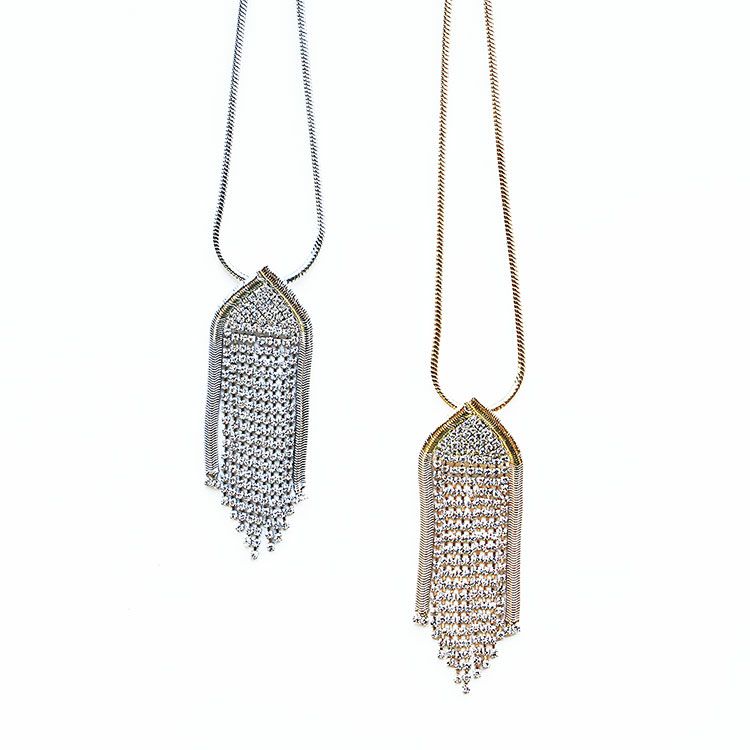 連なるクリスタルガラスが揺れながら繊細に輝くシャンデリアのようなエレガントなネックレス。動くたびに光が反射してキラキラと煌めき、存在感を放ちます。チェーンは遠目で見るとまるで金属でできた紐のような印象の肌触りが滑らかなスネーク・チェーン。お出掛けやパーティー、結婚式、2次会などはもちろん、カジュアルダウンしてデニムやニット使いなど、普段使いにも幅広くご使用いただけます。