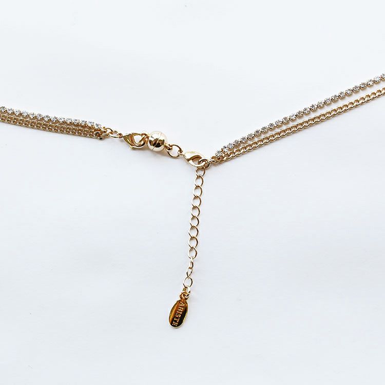 連なるクリスタルガラスが揺れながら繊細に輝くシャンデリアのようなエレガントなネックレス。クリスタルガラスが連なるモチーフから続くチェーンは、喜平チェーンとの2連。モチーフからチェーンまで動くたびに光が反射してキラキラと煌めき、存在感を放ちます。お出掛けやパーティー、結婚式、2次会などはもちろん、カジュアルダウンしてデニムやニット使いなど、普段使いにも幅広くご使用いただけます。