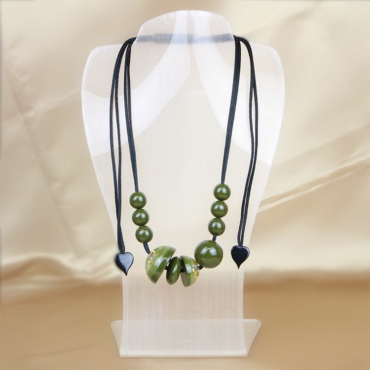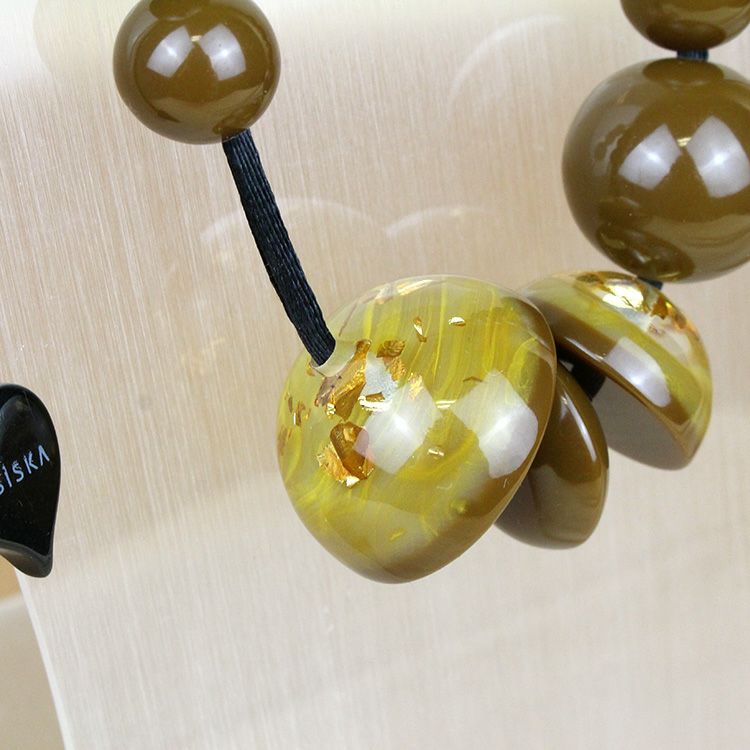 上質な樹脂、ポリエステルレジンの特性を活かし、ガラスのような質感を再現しつつも、軽くてつけやすいことで人気を博しています。肌に触れる部分に金属を使用していないため、アレルギーの方でも安心してお使いいただけます。