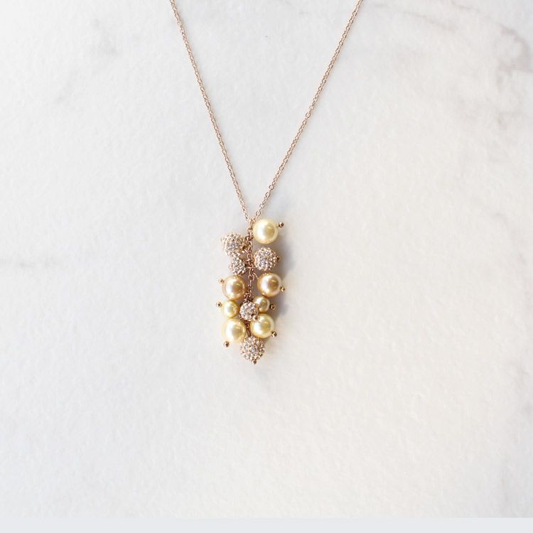 肌に馴染みやすいピンクゴールドの細みのロングチェーン。ペンダントには 大小異なるパールとクリスタルがほどこされたオーブ状のモチーフが連なっています。