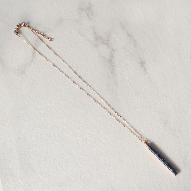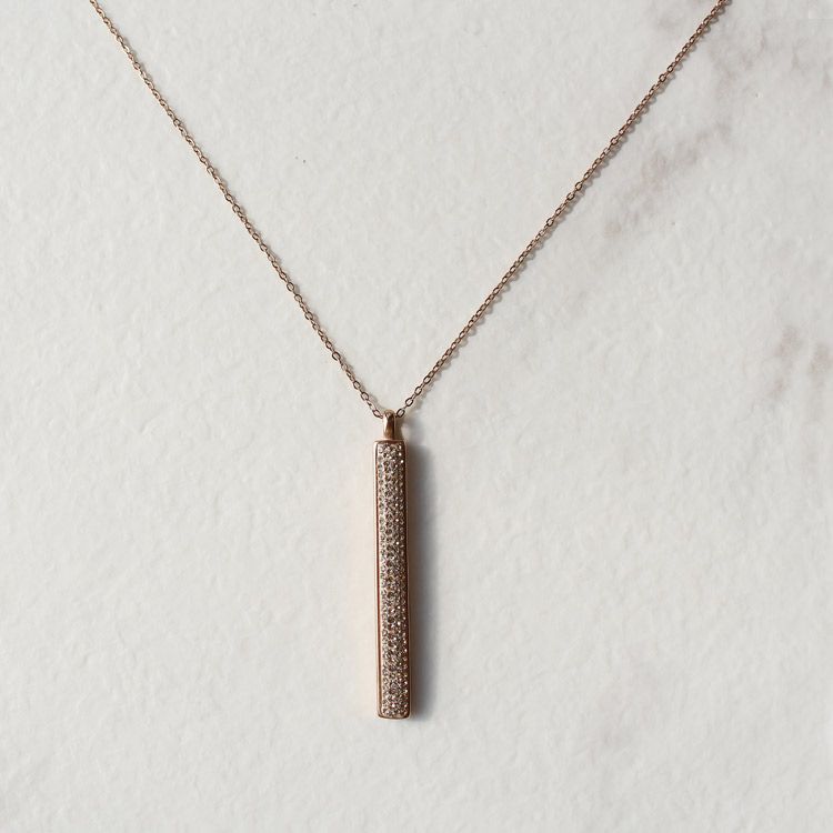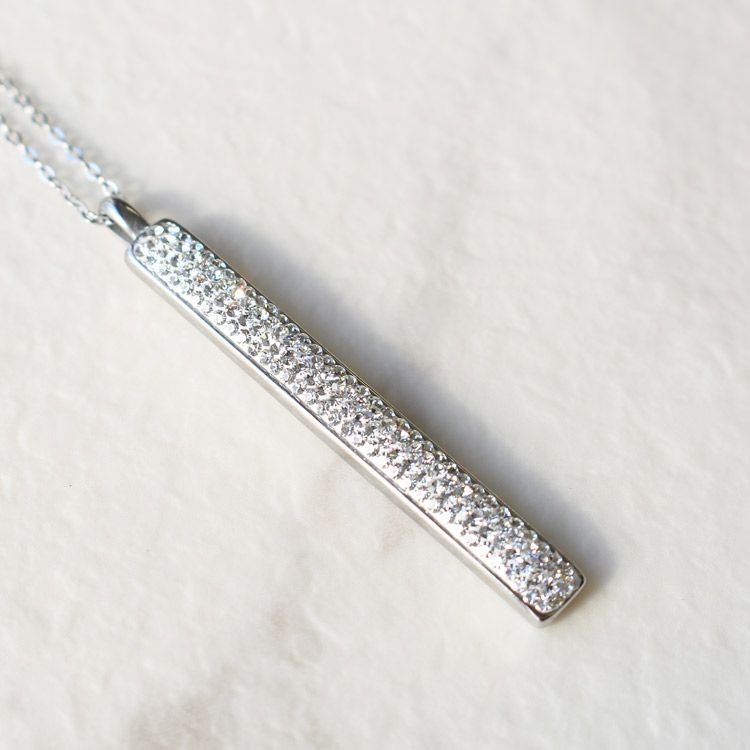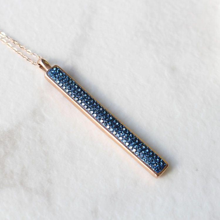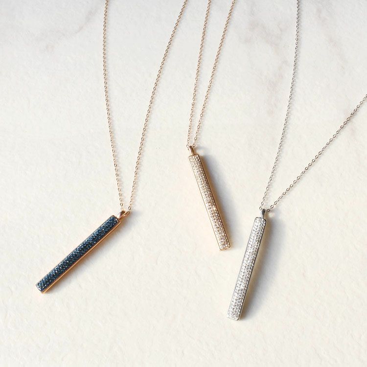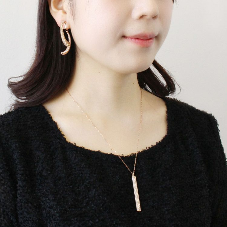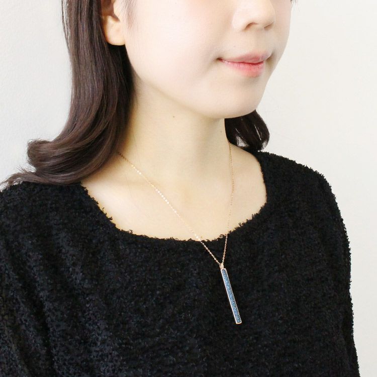 細みのチェーンに縦長フォルムのペンダントが胸元を綺麗にみせてくれます。丸みを帯びたペンダントの表面には無数のチェコクリスタルガラスがあしらわれ、フェミニンな印象をあたえてくれます。