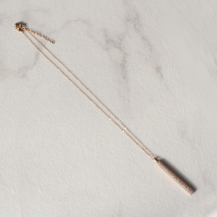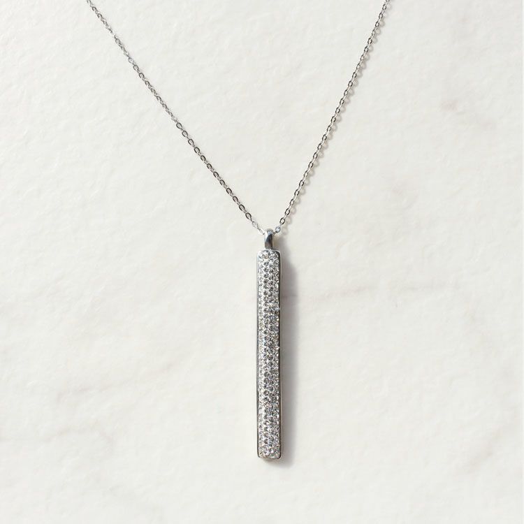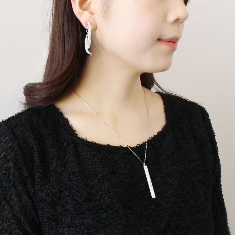 細みのチェーンに縦長フォルムのペンダントが胸元を綺麗にみせてくれます。丸みを帯びたペンダントの表面には無数のチェコクリスタルガラスがあしらわれ、フェミニンな印象をあたえてくれます。