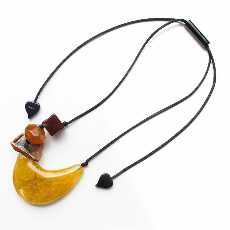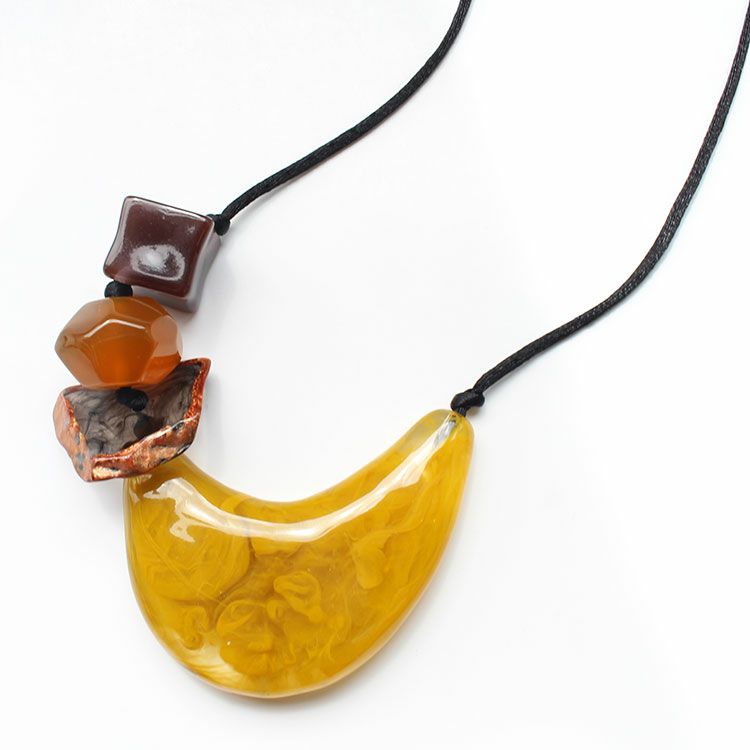上質な樹脂、ポリエステルレジンの特性を活かし、ガラスのような質感を再現しつつも、軽くてつけやすいことで人気を博しています。肌に触れる部分に金属を使用していないため、アレルギーの方でも安心してお使いいただけます。