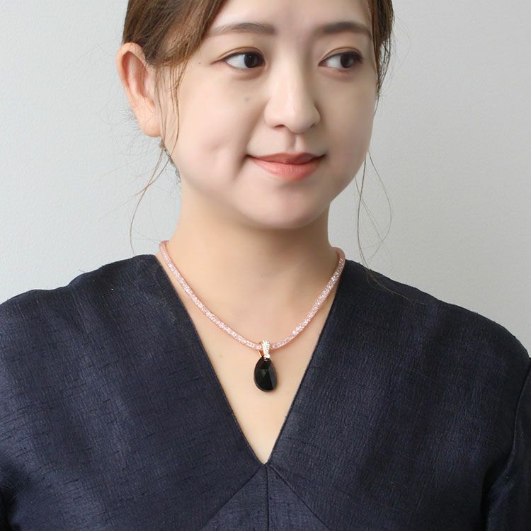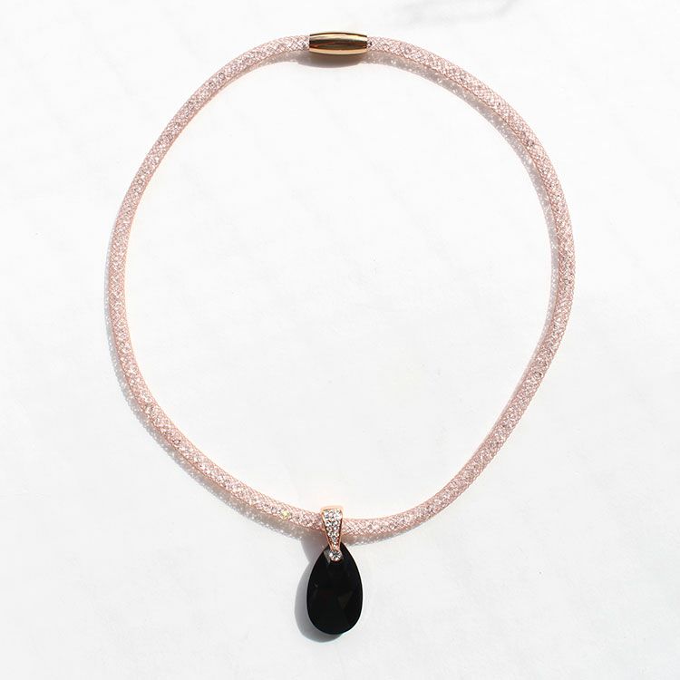 ブラックのクリスタルガラスのドロップモチーフが印象的なショートネックレス。キラキラと輝きを放つ、カットガラスで満たされたメッシュコードは付け心地軽やか。マグネットクラスプで着脱も簡単です。