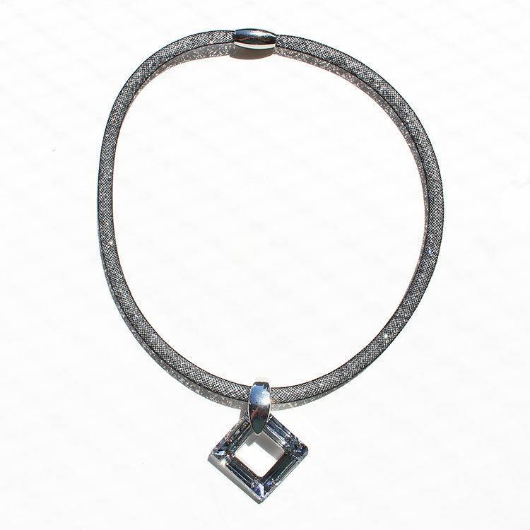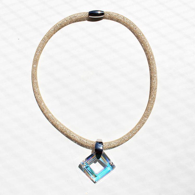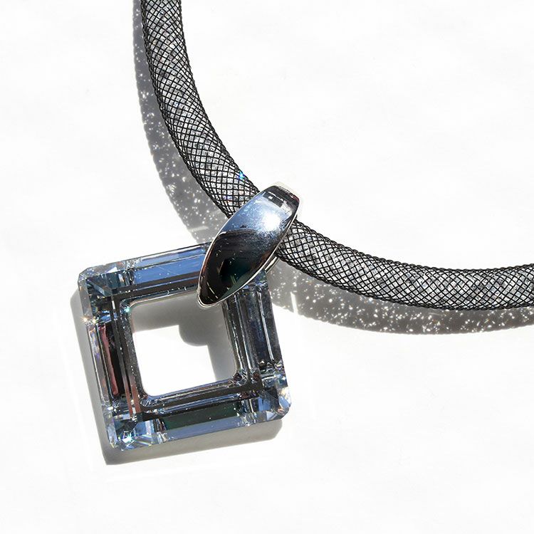 大きなクリスタルガラスのスクエアモチーフが印象的なショートネックレス。キラキラと輝きを放つ、カットガラスで満たされたメッシュコードは付け心地軽やか。マグネットクラスプで着脱も簡単です。