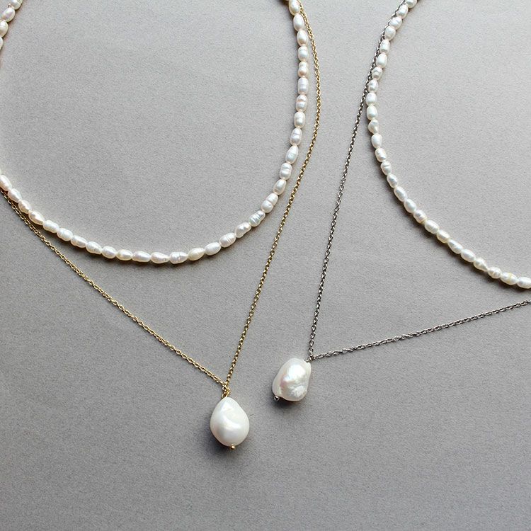 華奢なチェーンに大ぶりの淡水パールのペンダントトップと一粒ずつ表情の違う淡水パールを組み合わせたネックレスが2連になったショートネックレス。