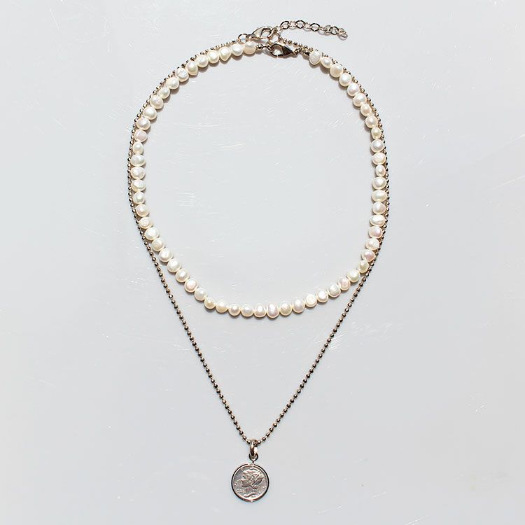 アメリカ10セントマーキュリーダイムコインネックレスと淡水パールネックレスでオシャレな重ね付けがすぐにお楽しみいただける3wayネックレス。レイヤードデザインを楽しめるほか、それぞれ独立しているので、単品でもお愉しみいただけます。