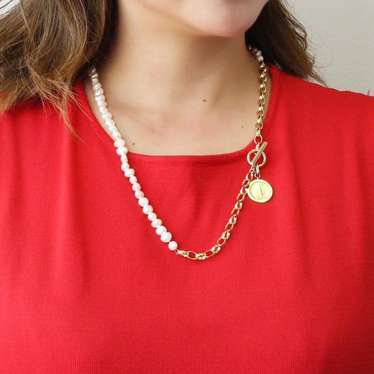 アメリカ10セントマーキュリーダイムコインと淡水パールの両方が一度に楽しめるロングネックレス。留め具のマンテルがアクセントになったオシャレなデザインは、幅広いシーンにご利用いただけます。