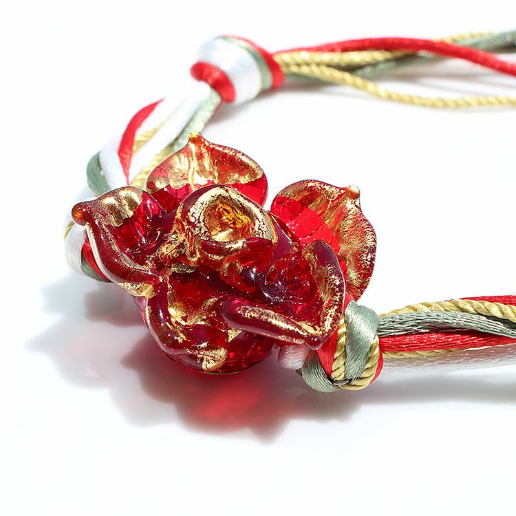 「オロロット(壊れた金箔)」の名のとおり、金箔が美しくクラッシュ模様を描くムラーノ島の伝統技法を用いて作られたローズモチーフパーツをシックなカラーのコードに通したネックレス。ノスタルジックなムードなのにどこか新鮮な、世代を超えて長く愛されるベネチアンガラスの魅力が感じられるネックレスです。