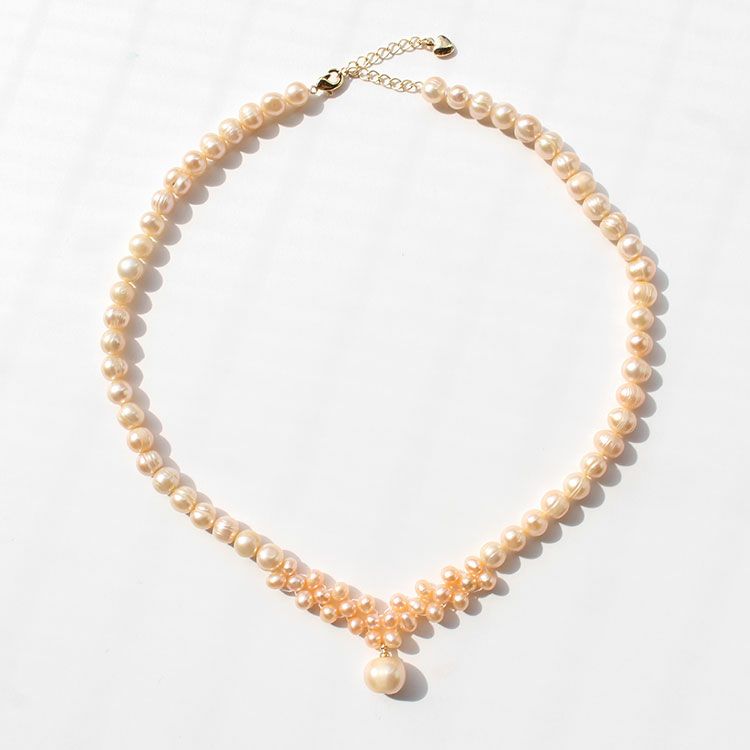優しい色合いのサーモンピンクよりのライトピンクの淡水パールネックレス。一粒一粒表情の異なる淡水パールは、唯一無二の存在。カジュアルからフォーマルまでさまざまなシーンでお使いいただけます。