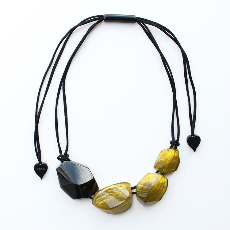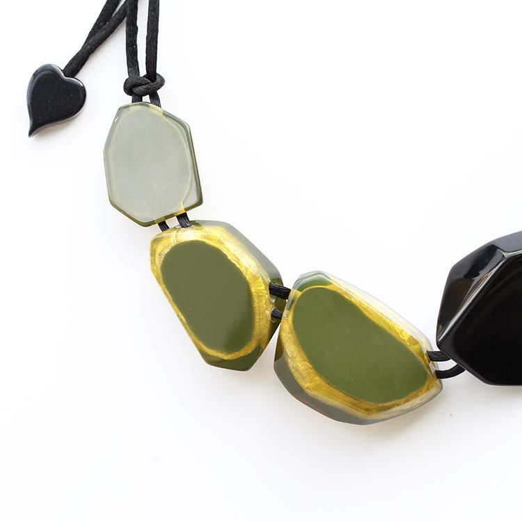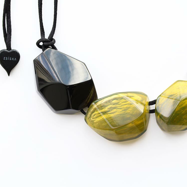 上質な樹脂、ポリエステルレジンの特性を活かし、ガラスのような質感を再現しつつも、軽くてつけやすいことで人気を博しています。肌に触れる部分に金属を使用していないため、アレルギーの方でも安心してお使いいただけます。