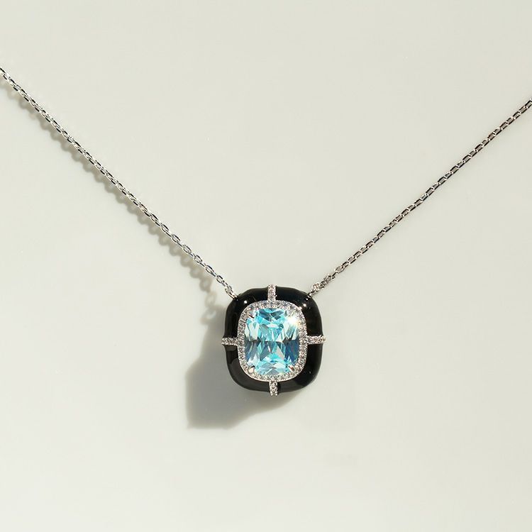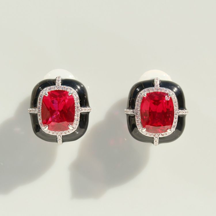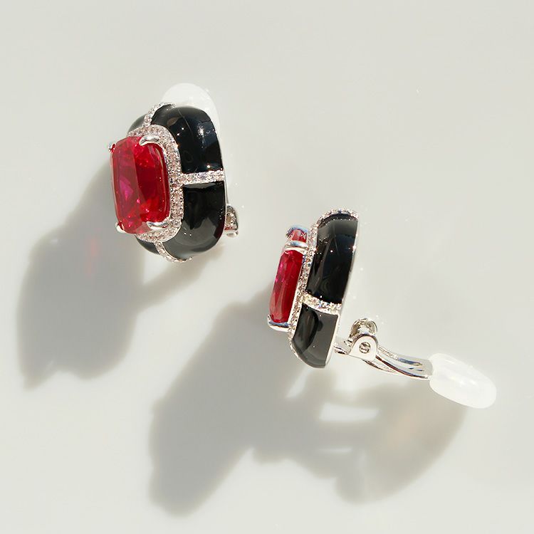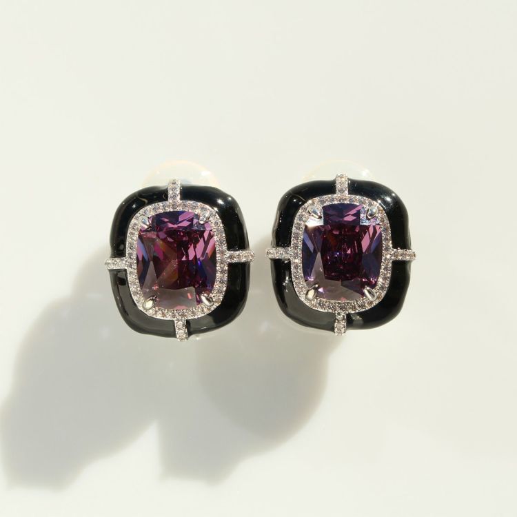 クッションカットの大ぶりセンターストーンが華やかな輝きを放ち、周囲を囲むブラックのエナメルが印象をキリッと引き締めます。