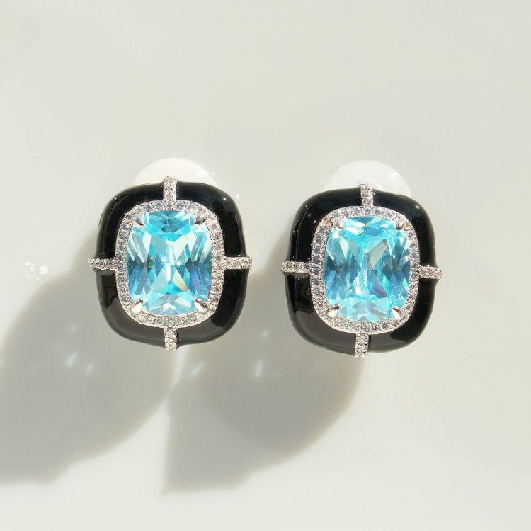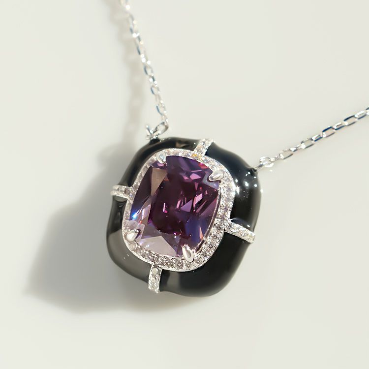 クッションカットの大ぶりセンターストーンが華やかな輝きを放ち、周囲を囲むブラックのエナメルが印象をキリッと引き締めます。
